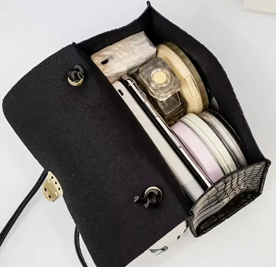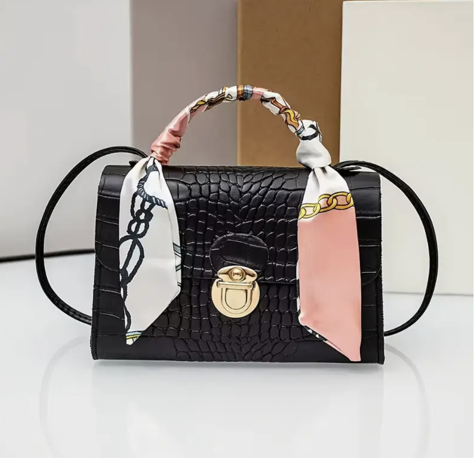 Sac noir, matière crocodile, avec foulard très classe, fermeture doré