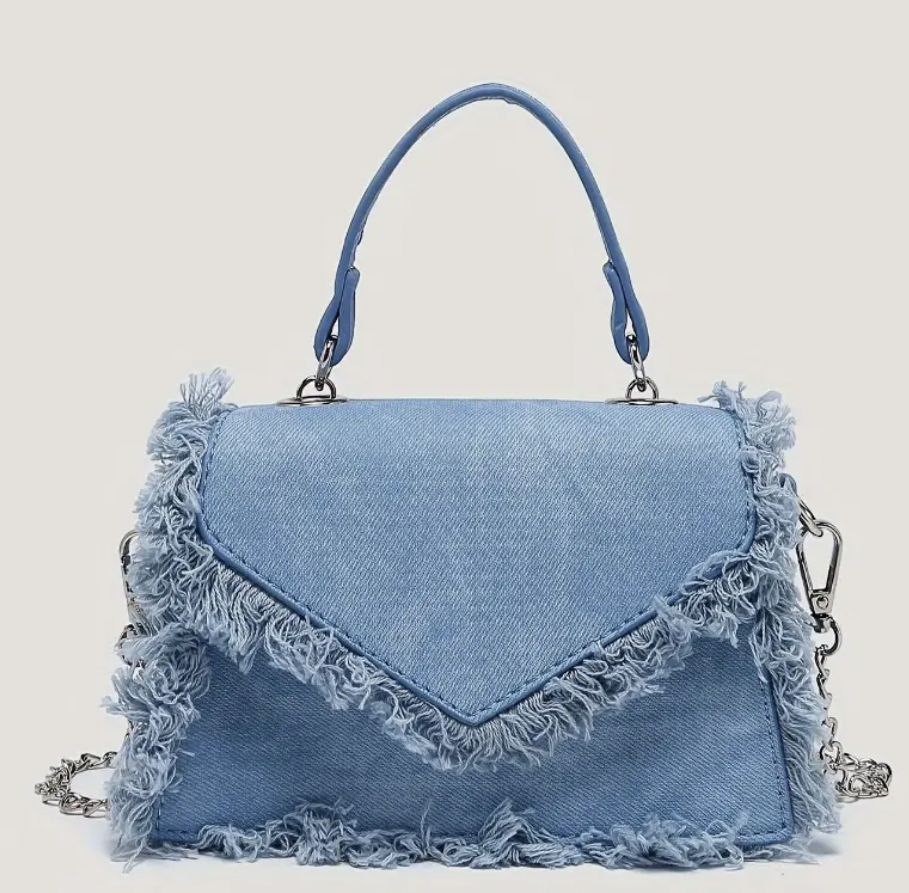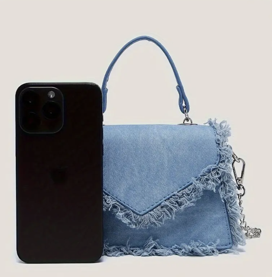 Sac bleu en sytle jeans, très chic et à la mode, sac bandoulière, sac à main élégant avec bandoulière chaîne, doublure en polyester, facile d'entretien